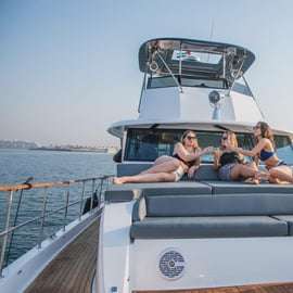 This is more than just a yacht charter, it’s a chance to see Dubai in its most enchanting form. During the day, you’ll marvel at sparkling seas under the sun. In the evening, watch the sky shift to shades of pink and gold during sunset. At night, the city transforms into a glittering wonderland, with lights reflecting off the water as you cruise past world-famous landmarks.