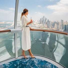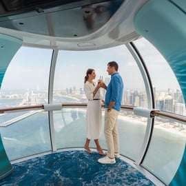 Odkryj Dubaj z wysokości 250 metrów na pokładzie największego i najwyższego koła obserwacyjnego na świecie dzięki odprawie premium i napojowi w salonie Seaview Lounge w Ain Dubai.