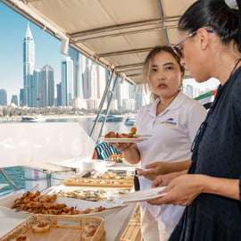 Dołącz do wspólnego rejsu o zachodzie słońca lub rejsu nocnego w Dubaju. Podziwiaj wspaniałe widoki, delektując się kanapeczkami, sajgonkami, kanapkami, owocami, napojami bezalkoholowymi, piwem, winem i winem musującym.