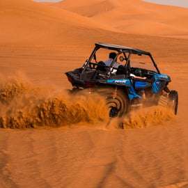 Odbierzemy Cię z hotelu luksusowym, klimatyzowanym jeepem 4x4. Po krótkim postoju na dostosowanie ciśnienia w oponach (i ewentualnej wizycie w toalecie, zrobieniu zdjęć z sokołami lub pierwszej próbie jazdy na quadach), ruszymy na podbój wydm!
