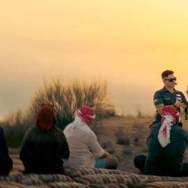 Zachód słońca uświetni pokaz sokolnictwa – zapierający dech w piersiach spektakl! Następnie udasz się do wyjątkowego obozu beduińskiego, położonego w oazie prywatnego spokoju. Zanurz się w arabskiej kulturze: spróbuj aromatycznej kawy, podziwiaj tradycyjne pieczenie chleba, ozdób dłonie henną i wybierz się na niezapomnianą przejażdżkę wielbłądem.