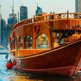 Wskocz na tradycyjną arabską łódź dhow, oferującą wygodne i stylowe miejsce do podziwiania zabytków. Na pokładzie zafunduj sobie wykwintne posiłki. Delektuj się międzynarodową kuchnią, oglądając rozrywkę na żywo, taką jak muzyka, występy taneczne lub pokazy kulturalne.